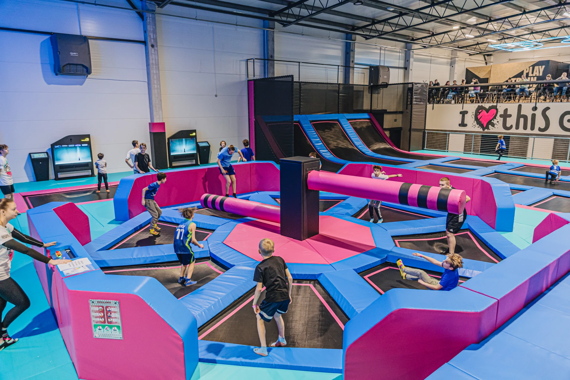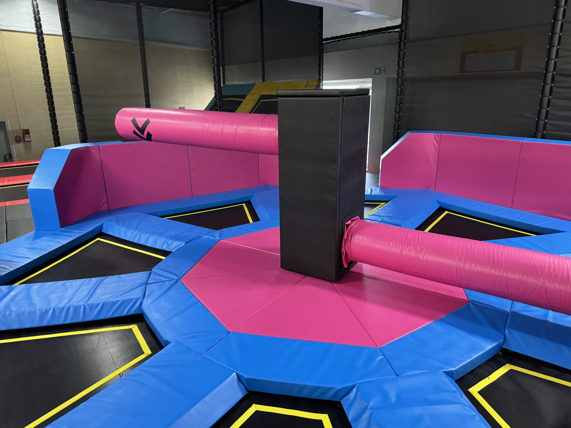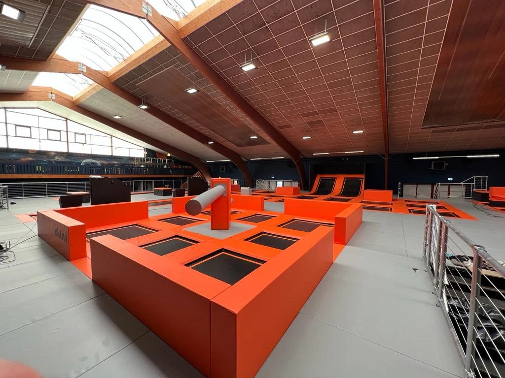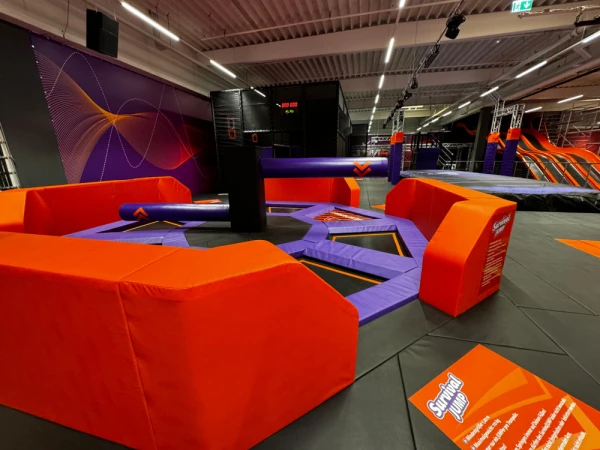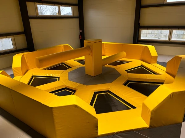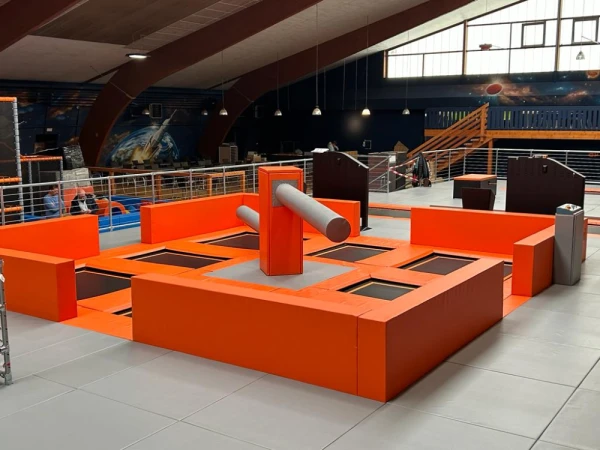 Breakdowns of mechanical attractions generate losses. As a direct trampoline park manufacturer, we focus on absolute reliability. Our design includes the precise selection of control motors responsible for smooth and safe rotation. All production takes place in Europe. We cover the central module and moving beams with a thick layer of dense foam, which completely eliminates the risk of painful impacts.